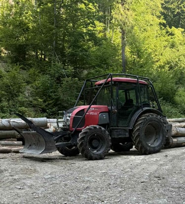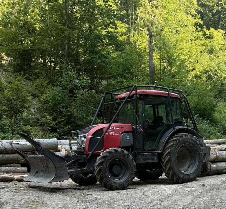 Silný traktor 4×4 s lesným vybavením (naviják, radlica, hydraulika) prispôsobený do ťažkých terénov a lesných prác.